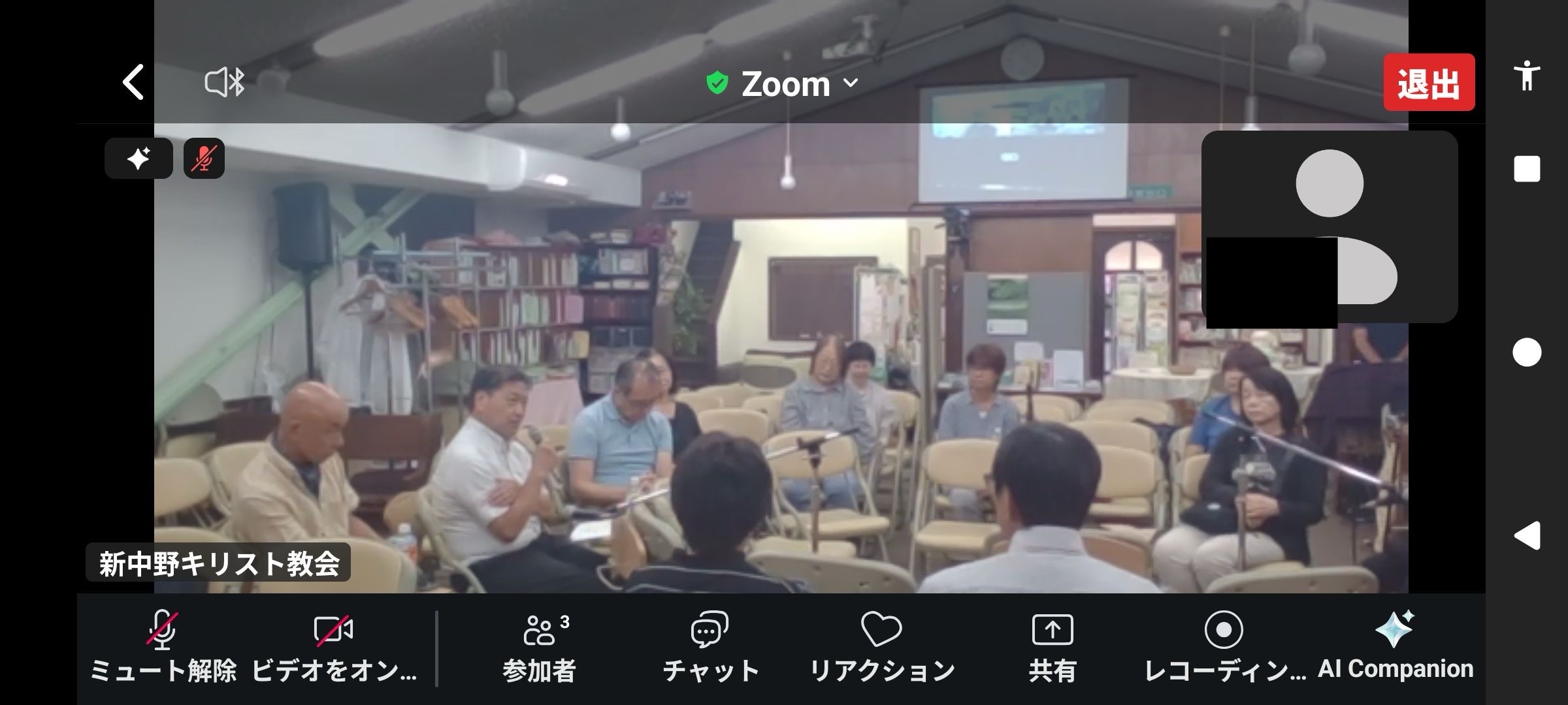 zoom参加は地方在住の方と我々のみ、他のみんなは教会に残って対面での話し合いとなりました。テーマは『新中野キリスト教会の改築』。