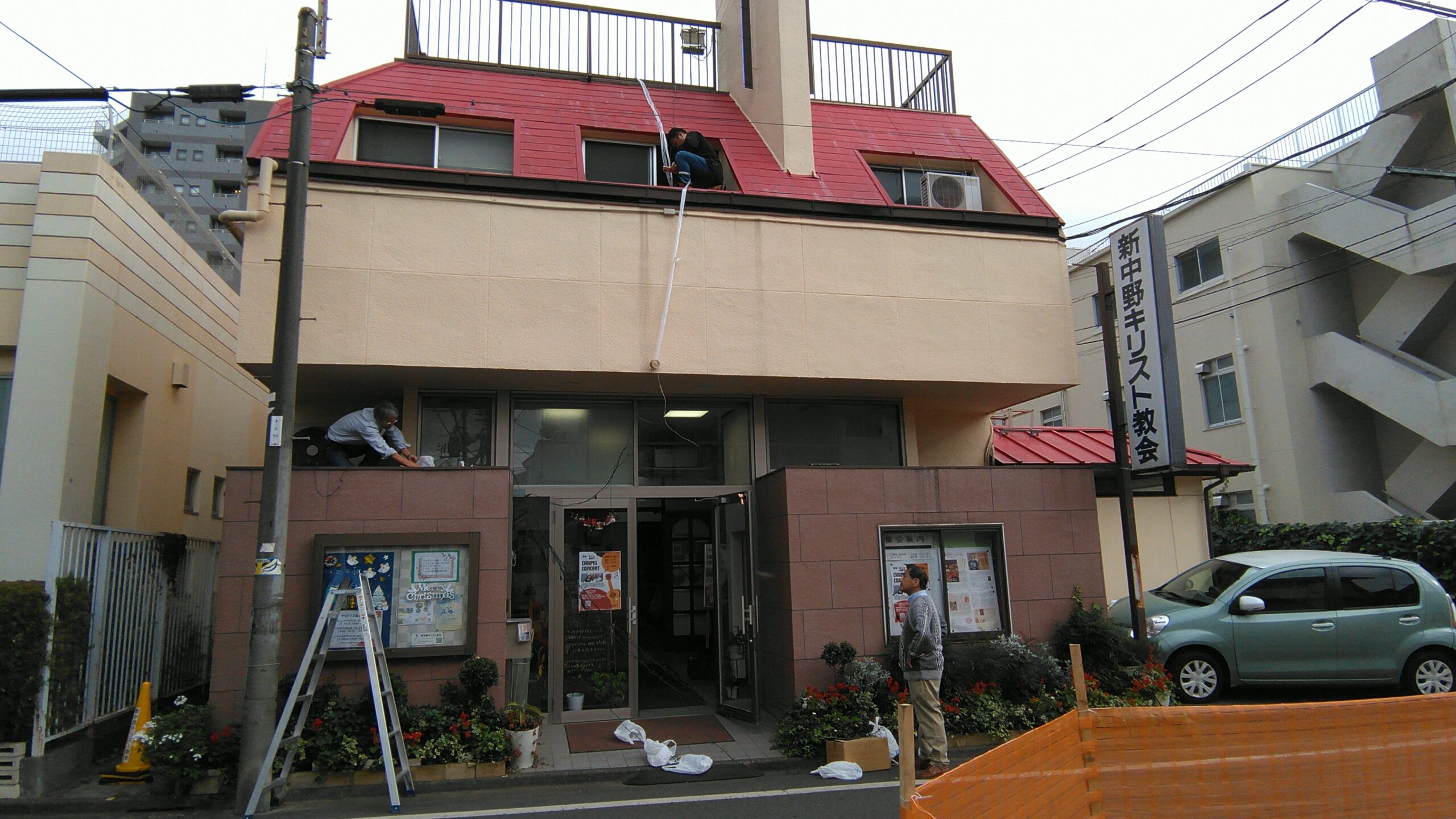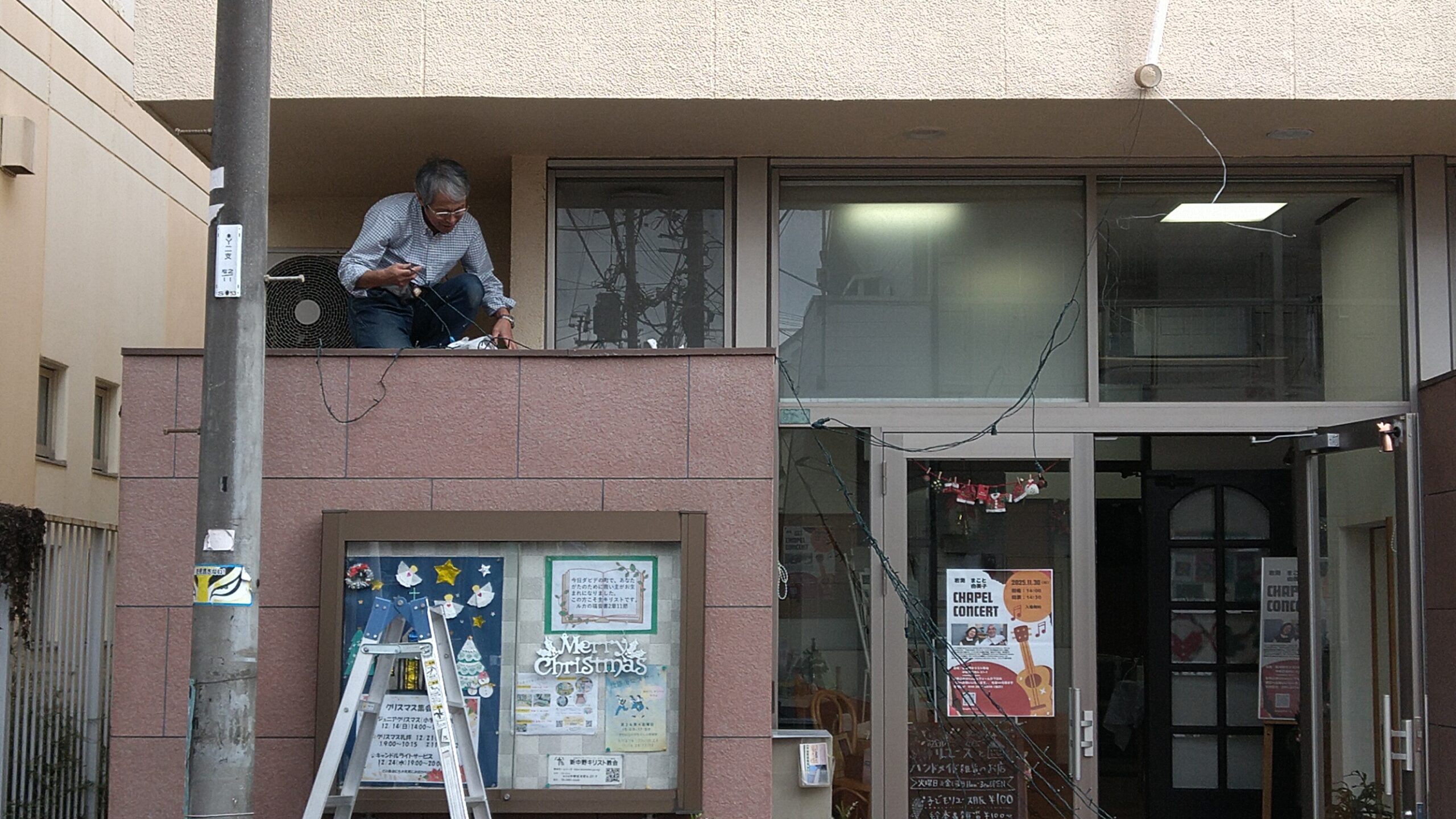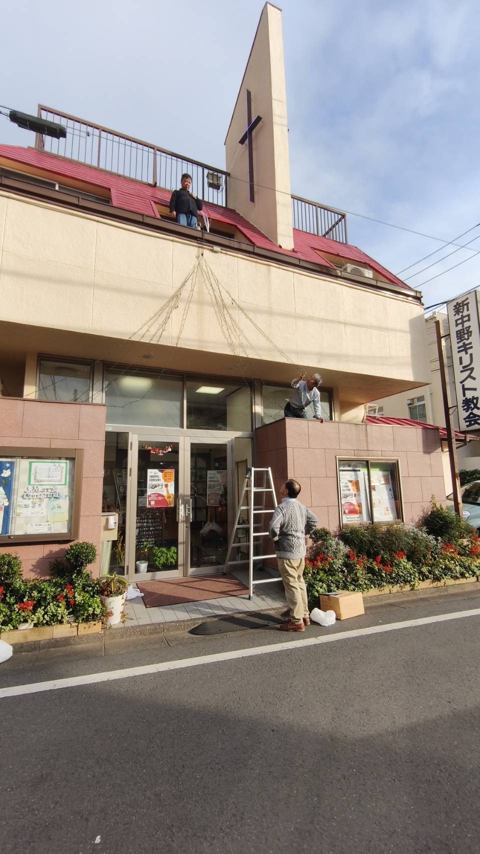 新中野キリスト教会のクリスマス飾り付け作業は生半可なものではありません。手慣れた信徒がスルスルと高いところに電線を這わせ、見事に整えています。