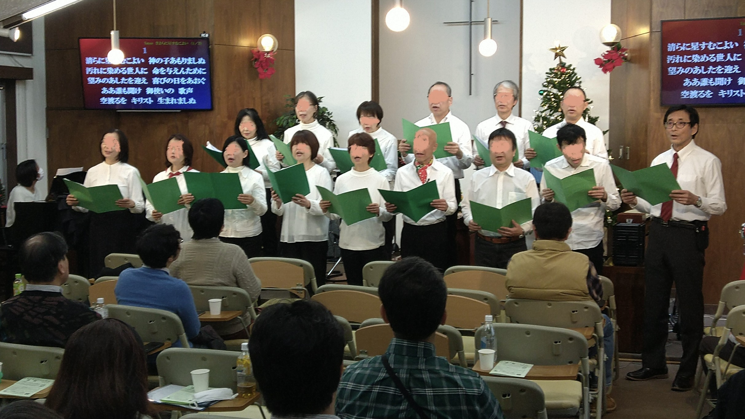 神様を誉め称える空気に包まれていた一曲目の後半、突然のトラブル発生。伴奏出力がストップしました。しかし、聖歌隊は誰1人としてたじろがない。賛美を止めることなく、アカペラで継続しました。