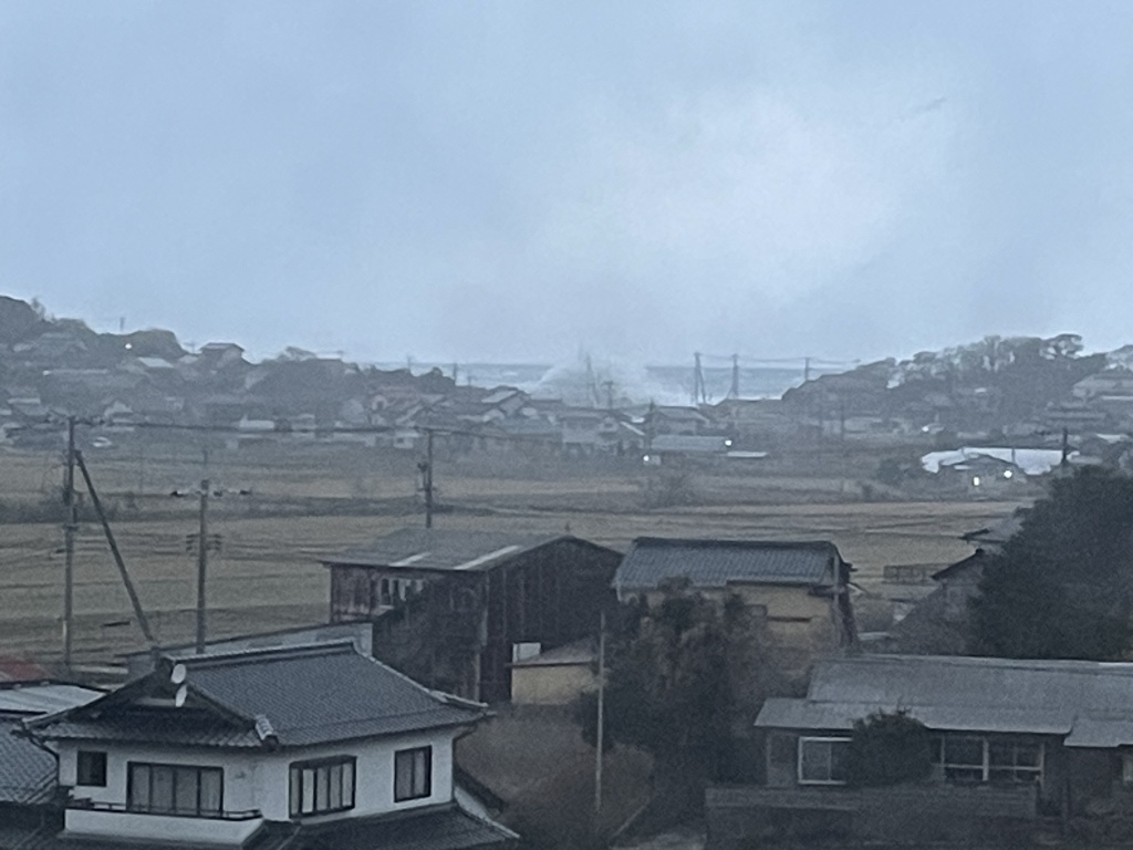 真ん中にある白く盛り上がったのは波です。手前に民家があるのがわかると思いますが、それよりも高い波です。冬の日本海は年に何度か10mくらいの波高の波が来るのですが、これがそれですね。近くまで行って撮ったらもっと迫力あったと思うのですが、寒いので挫けました。