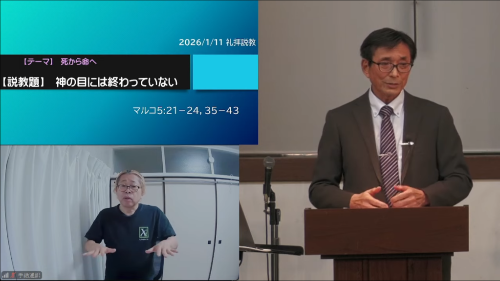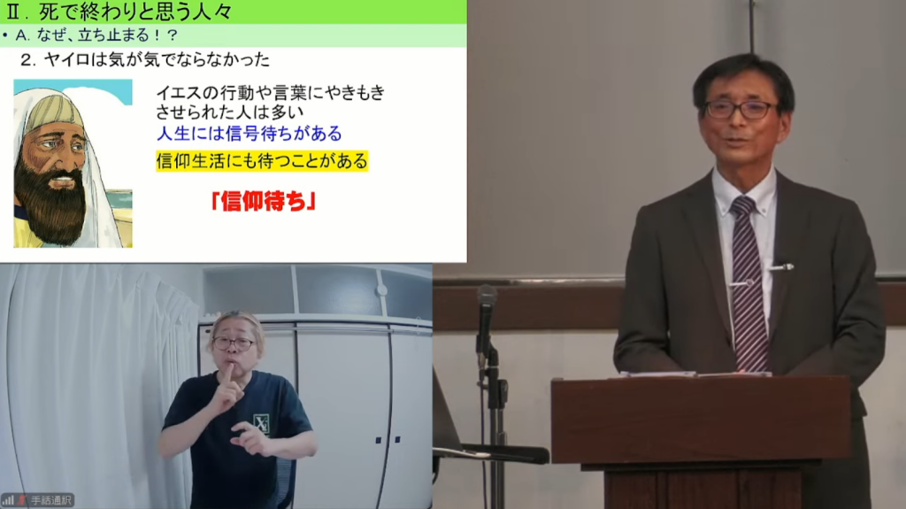 どうでもいい話なんですが、「ヤイロ」は指文字で表現しています。私は何年か前に右手がちょっと不自由になっていて、右肘の手術を受けています。腕を吊って来てたことを覚えておられる方もおられると思います。結局あれで完治してないものですから、右手で指文字をするのがあまり得意ではありません。さらに元々私の指文字は物凄く速くて、意識してゆっくりすると逆に指がもつれてしまいます。早口の人にゆっくり喋らせると言葉に詰まったりすると思うのですが、あれ手話でもあるんです。そんなわけで、「ヤイロ」はちょっとしんどかったです。逆に「マタイ1章」くらいだと、平気なんですが。
