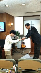 礼拝の時には、「成人祝福式」の「贈呈式」が行われました。 写真は藤井先生からお祝いをお渡ししているところです。